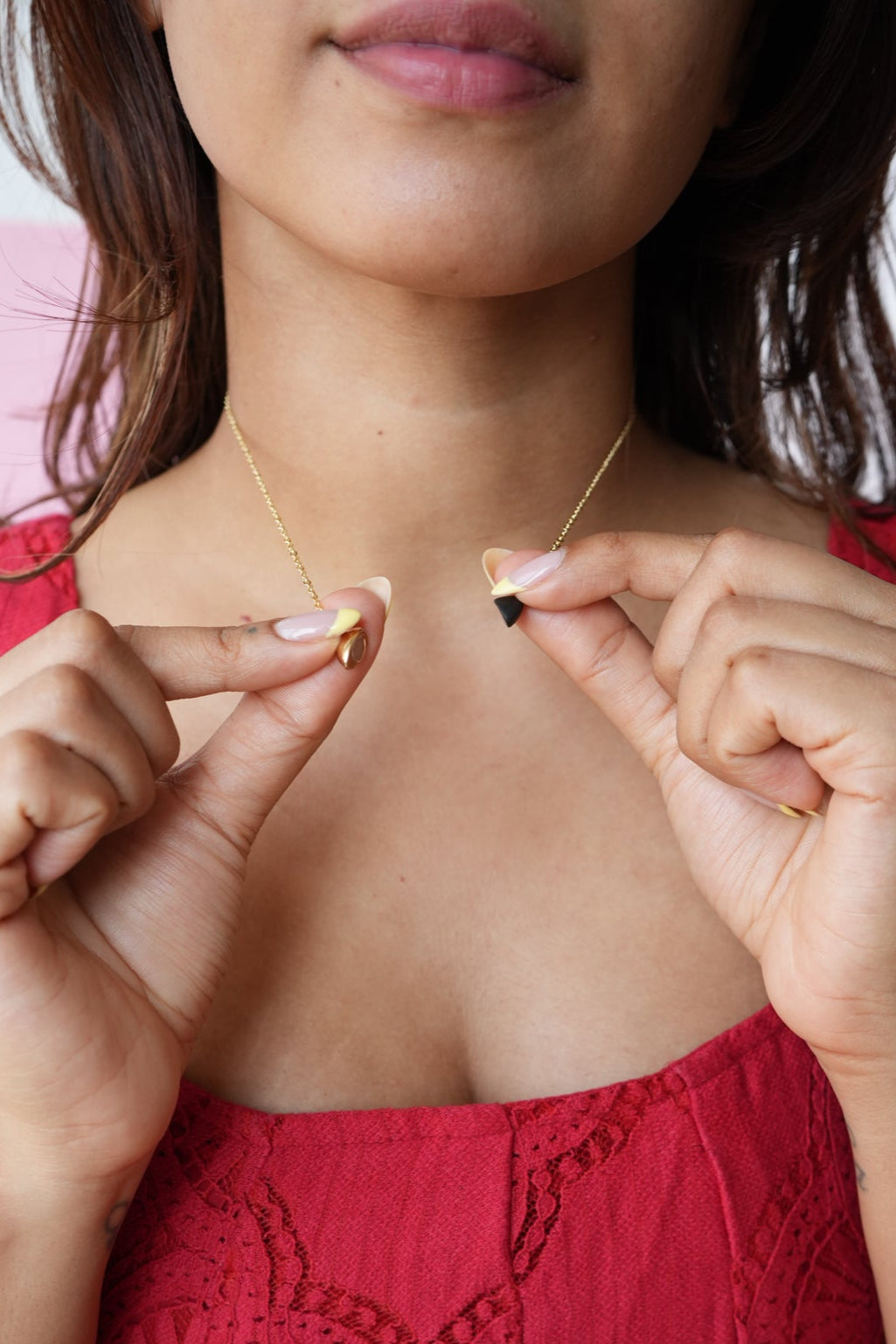 Embrace contrast with our Minimalist Two-Tone Heart Pendant Necklace. This charming piece features a petite heart pendant, elegantly split into a black half and a gold-toned half, offering a unique and modern aesthetic. Suspended on a delicate gold-toned chain, it's perfect for adding a hint of contemporary style and personal flair to any outfit, whether worn alone or layered.